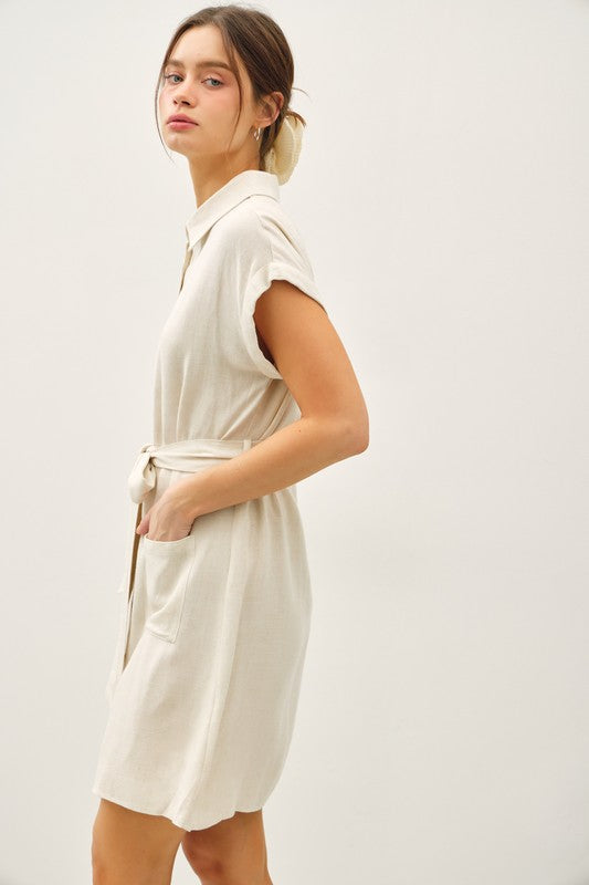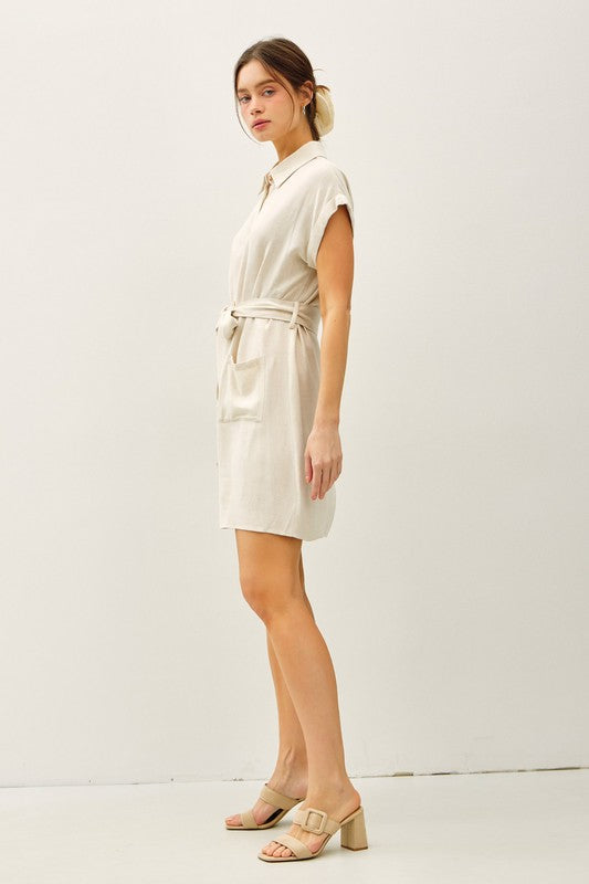 This button up short sleeve dress is the epitome of effortless summer style. The classic shirtdress silhouette features a collared neckline and button-up front that bring timeless sophistication, while the short sleeves and breezy linen blend fabric keep you cool and comfortable even on the warmest days. The front patch pockets add functional detail with a casual, relaxed vibe, while the tie at the waist allows you to cinch and define your silhouette for a flattering, customized fit. The short dress length is perfect for showing off your favorite sandals or sneakers while remaining appropriate for multiple occasions. The luxurious viscose-linen blend fabric offers beautiful drape and breathability with that perfect lived-in texture that gets better with every wear. Whether you're pairing it with sandals for a casual daytime look, styling it with wedges for brunch with friends, or dressing it up with heels and statement jewelry for evening events, this dress delivers incredible versatility. Wear the tie belted for a defined waist, leave it open for a relaxed fit, or even wear it unbuttoned as a lightweight duster over your favorite basics. The linen blend makes it ideal for vacation wear, beach cover-ups, or everyday summer styling. It's the kind of dress that makes getting dressed feel easy and effortless while looking polished and put-together.